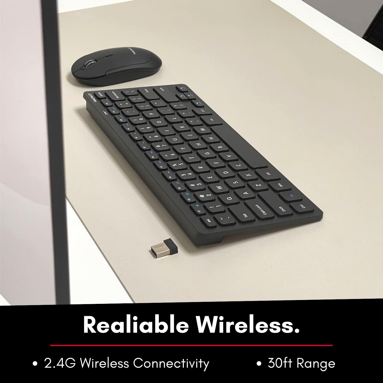 Introducing the Macally Small Wireless Keyboard and Mouse Combo for PC, the ultimate essential work duo for any desktop setup. This sleek and compact combo features a 2.4G wireless connection, allowing you to work seamlessly without any tangled cords.